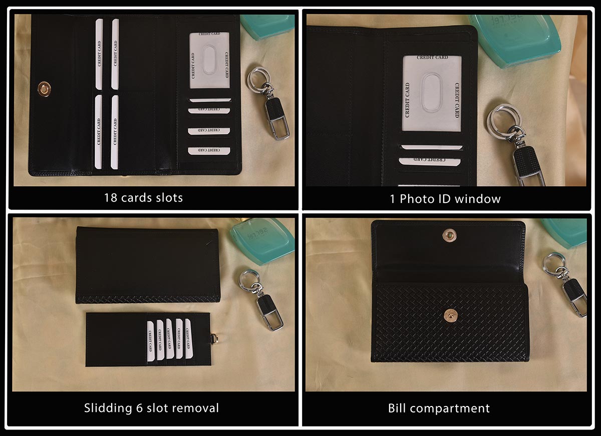 • Card Slots: Features dedicated card holders to neatly store your credit cards, debit cards, and ID.